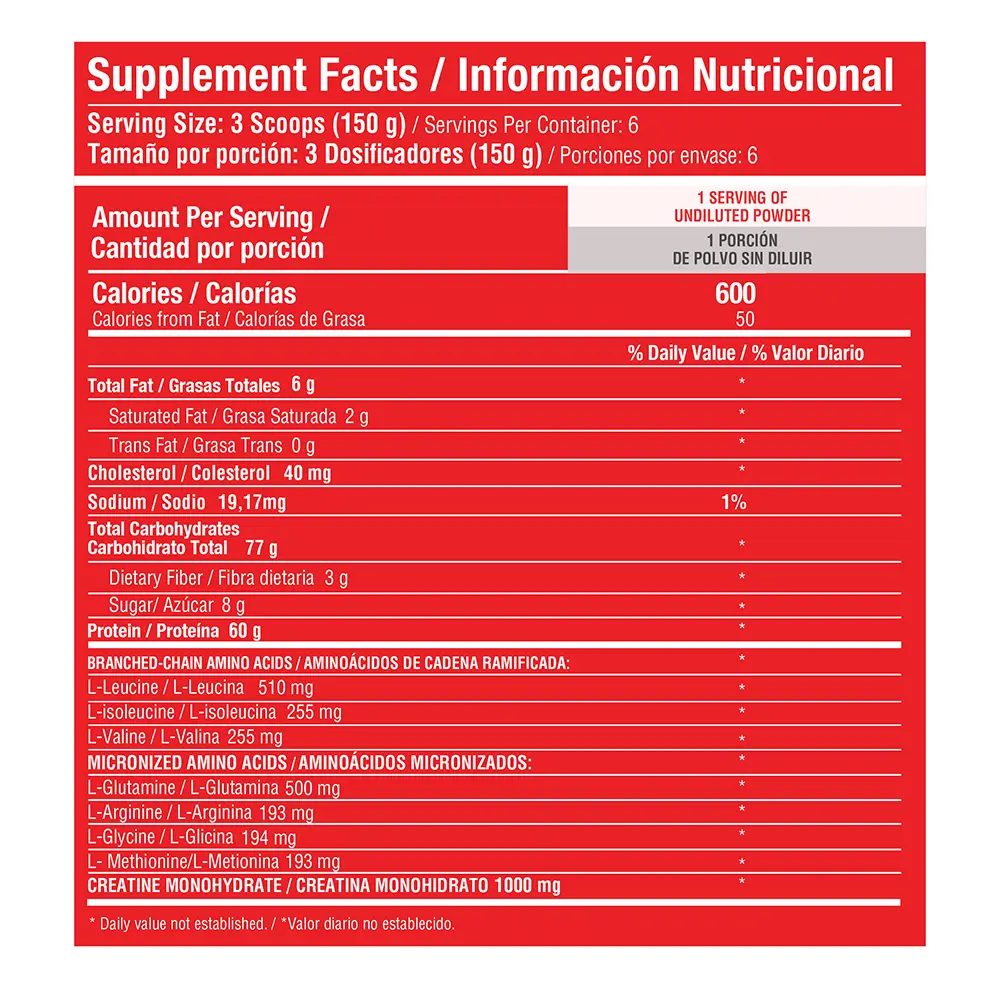 Ingredientes Principales: Proteína aislada de suero, proteína concentrada de suero, mezcla de carbohidratos.